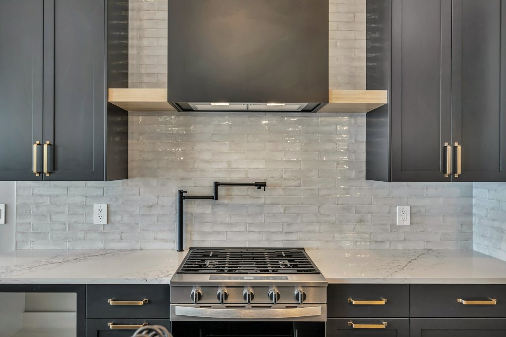 Upgrade Kitchen backsplash selection and extend full height to ceiling at floating shelves
