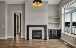 Add 18″ deep cabinets w/ full height doors to the RH of the Fireplace w/ quartz tops and (2) 12″ deep STC supplied floating shelves above. Doors to have clear glass and Proexx supplied plasma inserts