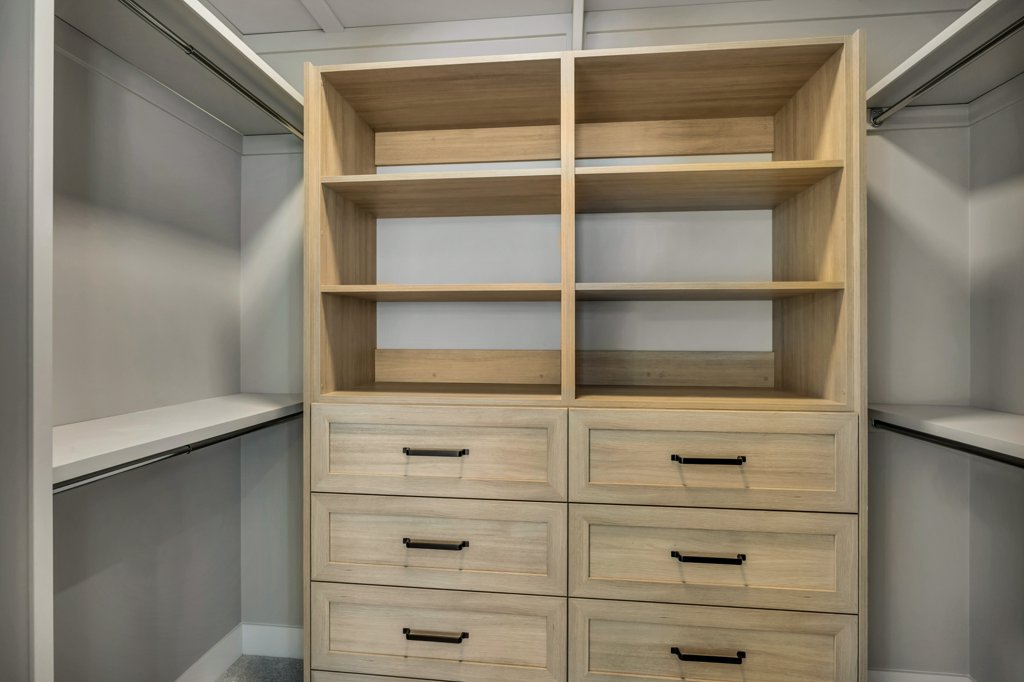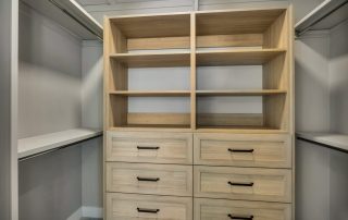 Add 18″ deep STC supplied cabinets to the back wall of WIC (2) 4’H bank of 4 drawers w/ open shelving above for a total height of 7′