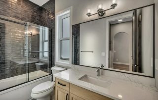 Add sliding glass door to main bath with black trim